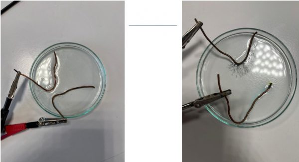 - Breng nu een gelijkspanning van 9 volt tussen de koperelektroden aan.