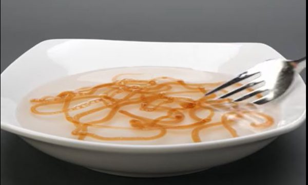 Wanneer de natriumalginaat- en calciumlactaatoplossingen zich vermengen, vormen ze onmiddellijk een nieuwe onoplosbareverbinding, calciumalginaat, die elastische buizen oplevert die op wormen lijken.
