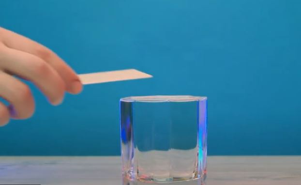 Munt op een kaart 1.Onderzoeksvraag Hoe komt het dat een munt op een kaart op een glas valt als het glas leeg is, niet valt als het glas gevuld is. 2. Materiaal + stoffen plastic kaart; munten; glas 3.Uitvoeren a.Werkwijze Plaats een plastic speelkaart op een leeg...