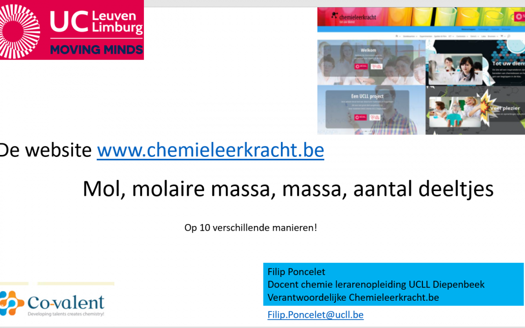 Videofragment: De mol In de webinar geven we tools aan om het begrip mol aan te brengen op een alternatieve manier. We verzamelden apps, analogieën, oefeningen, lesvideo’s, …. en veel oefeningen om dit begrip aan te brengen in de klas. Presentatie: LINK...